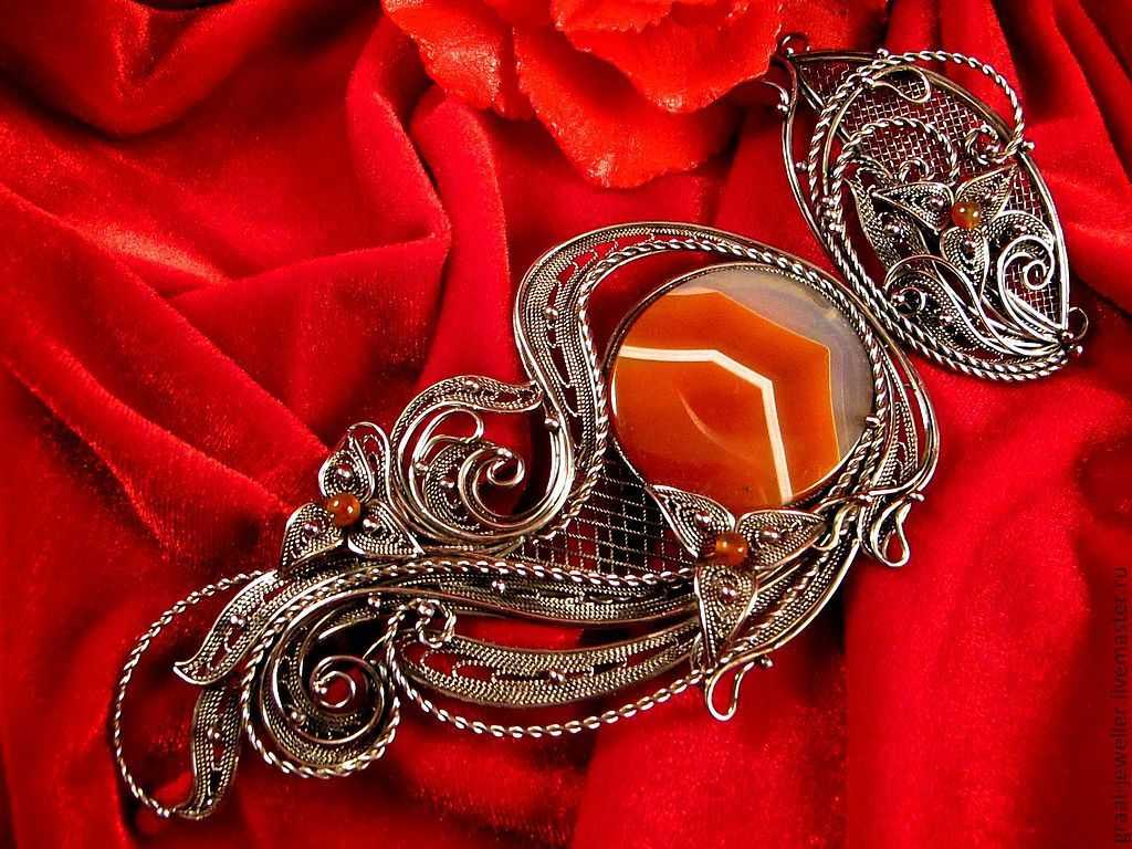 - Сердолик. Брошь или кулон – эффектный любовный талисман для женщин: замужним поможет сохранять крепкую семью, а свободным создать её. Чтобы процесс шёл быстрее, сделает даму мягче, менее вспыльчивой, позволит следить за словами и действиями.