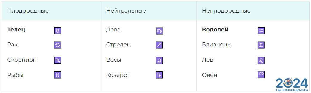 При этом, самым плодородным знаком считается Телец, а самым бесплодным – Володей.