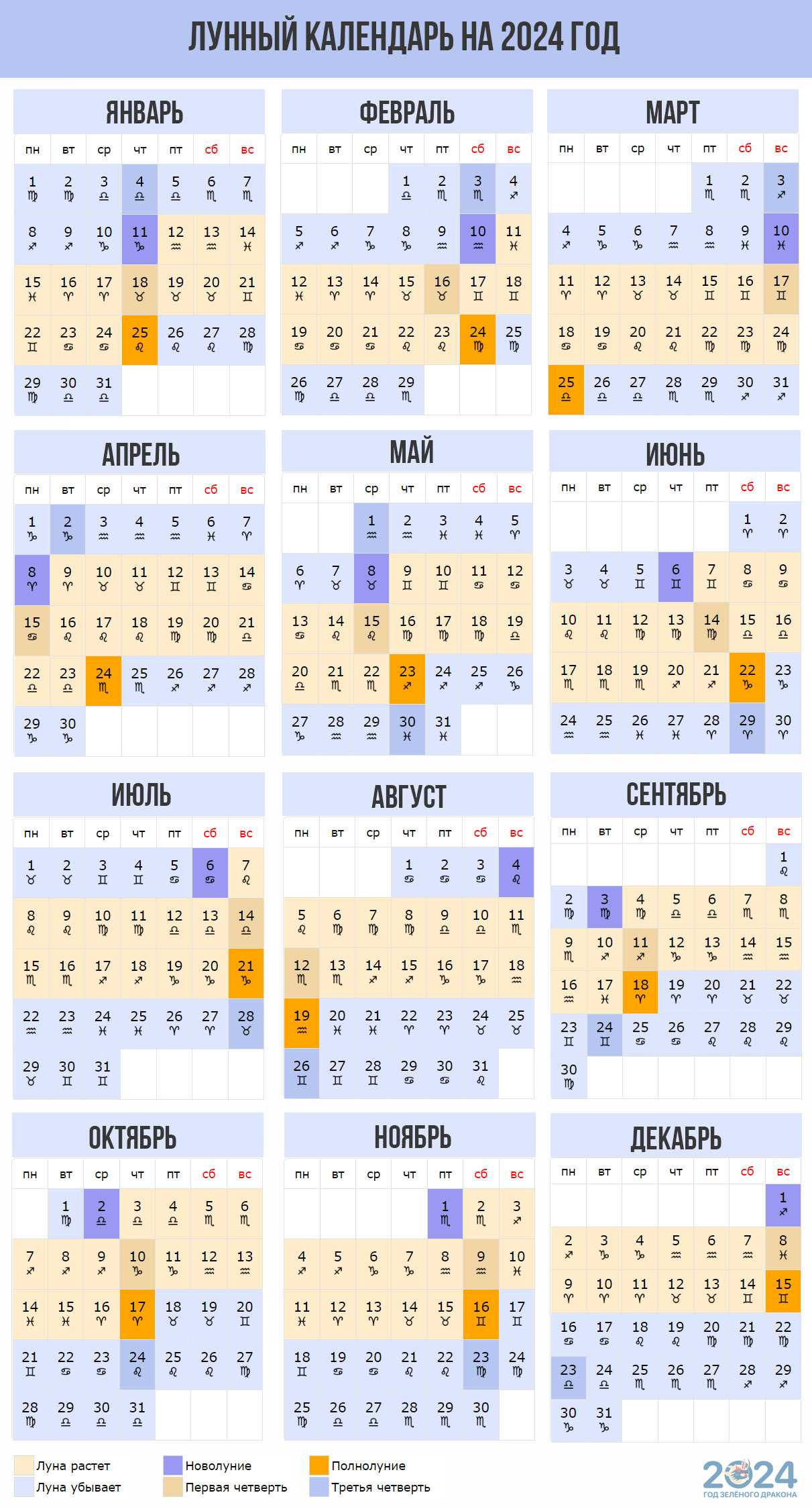 | Месяц | Растущая Луна | Убывающая Луна |