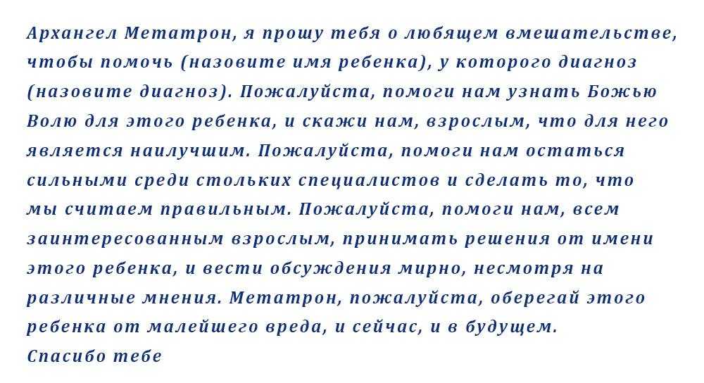 Быстрое исполнение желаемого будет происходить в отношении детей. Метатрон очень любит детей и подростков, покровительствует им. Все молитвы, связанные с детским здоровьем или подростковым становлением личности, будут услышаны первыми и немедленно исполнены. Для большей внутренней уверенности можно нарисовать на листке золотое сечение и держать при себе.