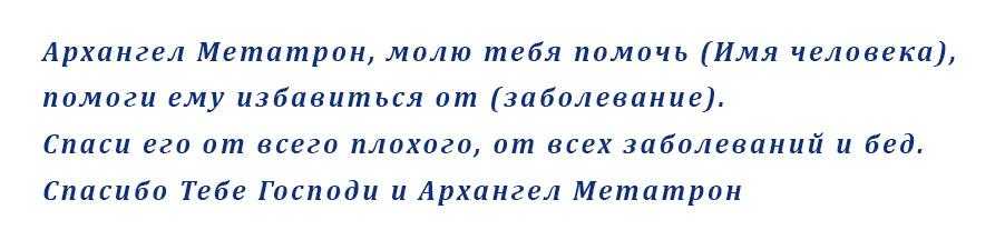 Молитвы архангелу Метатрону имеют чудотворную силу. Они способны исцелить, наполнить энергией, подсказать верный путь. Правда, существует одно правило: молитвы нельзя читать для себя. Если человеку необходима помощь, то попросить о ней самостоятельно не разрешается. В этом случае, следует попросить близкого человека обратиться к архангелу и попросить его.
