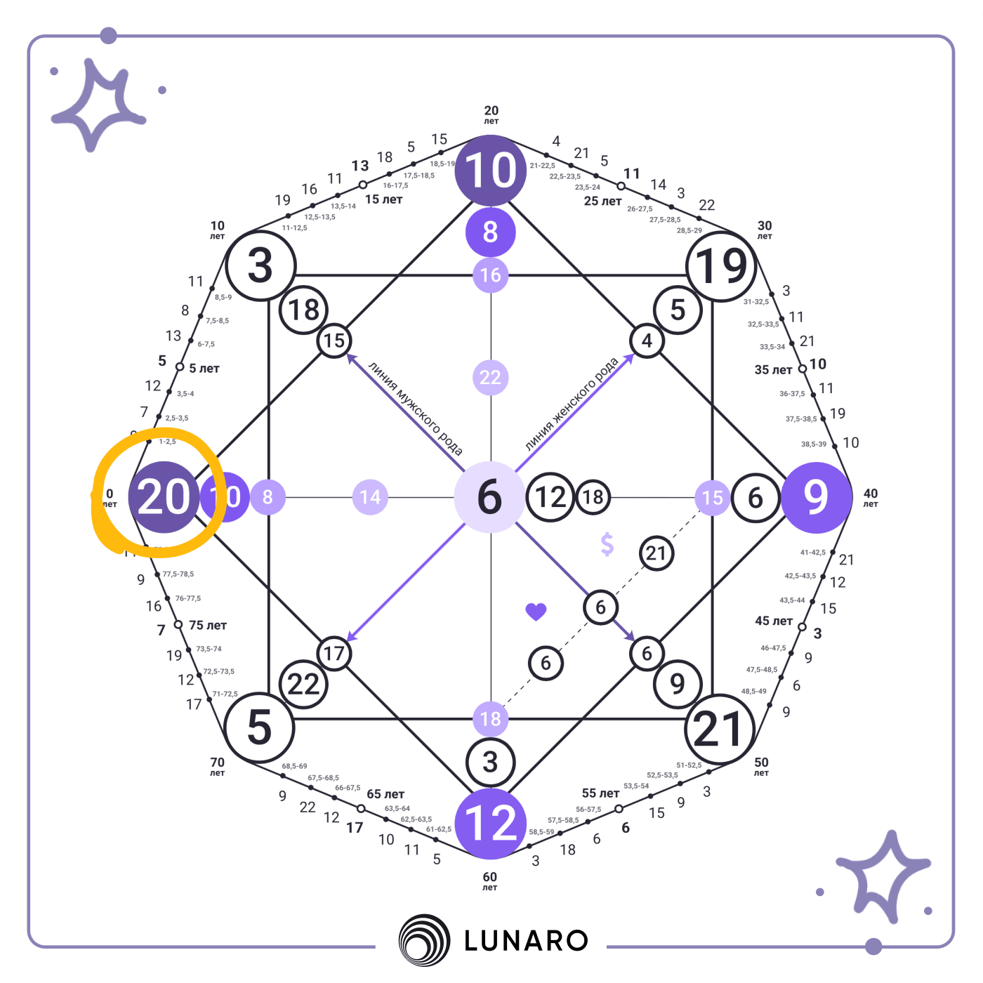Наименование Позиции на схемеОбщие аспекты Характер человека в плюсе и минусе А,ВЗадачи души до 40 лет СГлавная проработка души в текущем воплощении DЗона комфорта и гармонии EКармический хвост M,N,DРодовые программы по линиям предков F,H,G,IТаланты человека K,F2,G2Предназначение человека: личное, социальное, духовное формулаЧакровая карта здоровья формулаПрогноз по годам жизни формулаОтношения и любовь Знакомство и готовность к отношениям MОбщий характер отношений пары R1Проблемы в отношениях с партнёром RФинансы и работа Денежный канал LПрофессия и сфера успеха R2Денежный поток: блокировка и развитие RДети и родители Характер ребёнка, личные качества и советы родителям А,B,H1,I1Детско родительская карма А,O,JСамореализация и таланты ребёнка K, F2, G2