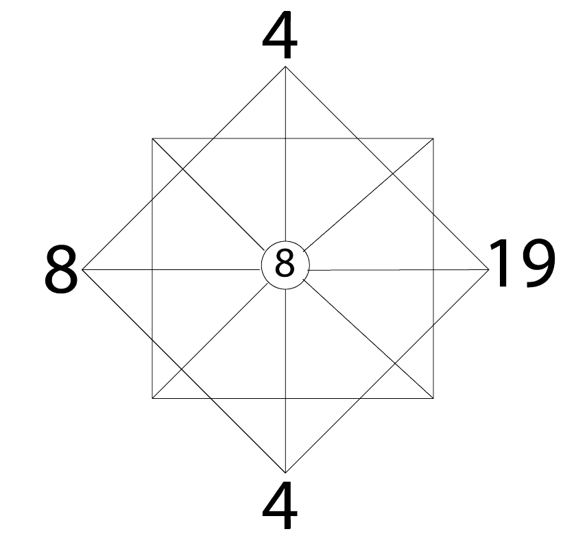 - В правом углу пишем сумму года рождения. 1+9+9+0=19 (помним, что если получилось число, больше 22, складываем его еще раз). Это число показывает наши цели и стремления. Если следовать своим главным задачам по этому числу и прорабатывать свои минусы, вам будут идти деньги, благополучие.