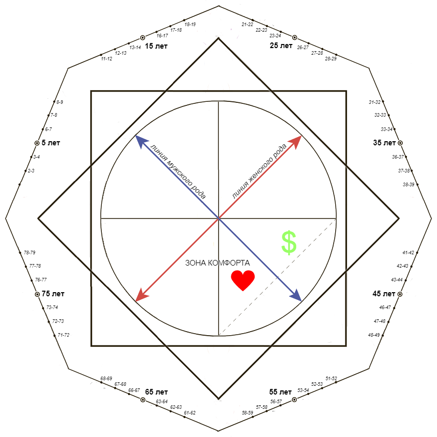 Матрица судьбы состоит из двух квадратов. Один расположен под углом 90°, а второй под 45°. Квадраты огибает окружность, в которой указаны годы жизни человека, внутри расположены основные линии (финансы и любовь), а также определенные области: Личное предназначение.