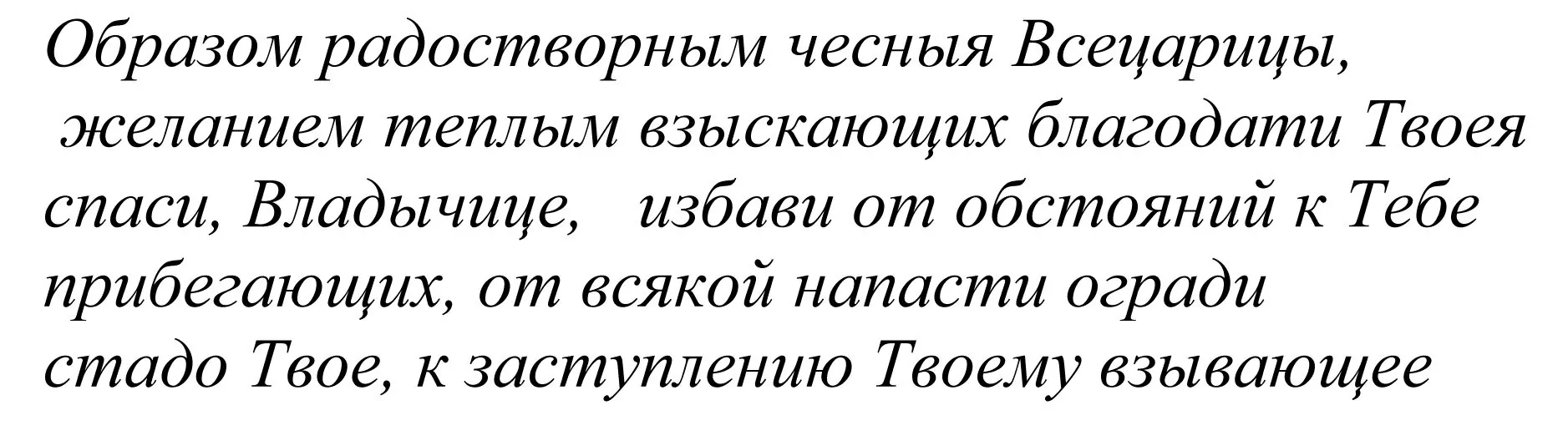 О́бразом радостотво́рным честны́я Всецари́цы,/ жела́нием те́плым взыска́ющих благода́ти Твоея́ спаси́, Влады́чице,/ изба́ви от обстоя́ний к Тебе́ прибега́ющих;/ от вся́кия напа́сти огради́ ста́до Твое́,// к заступле́нию Твоему́ взыва́ющее при́сно.