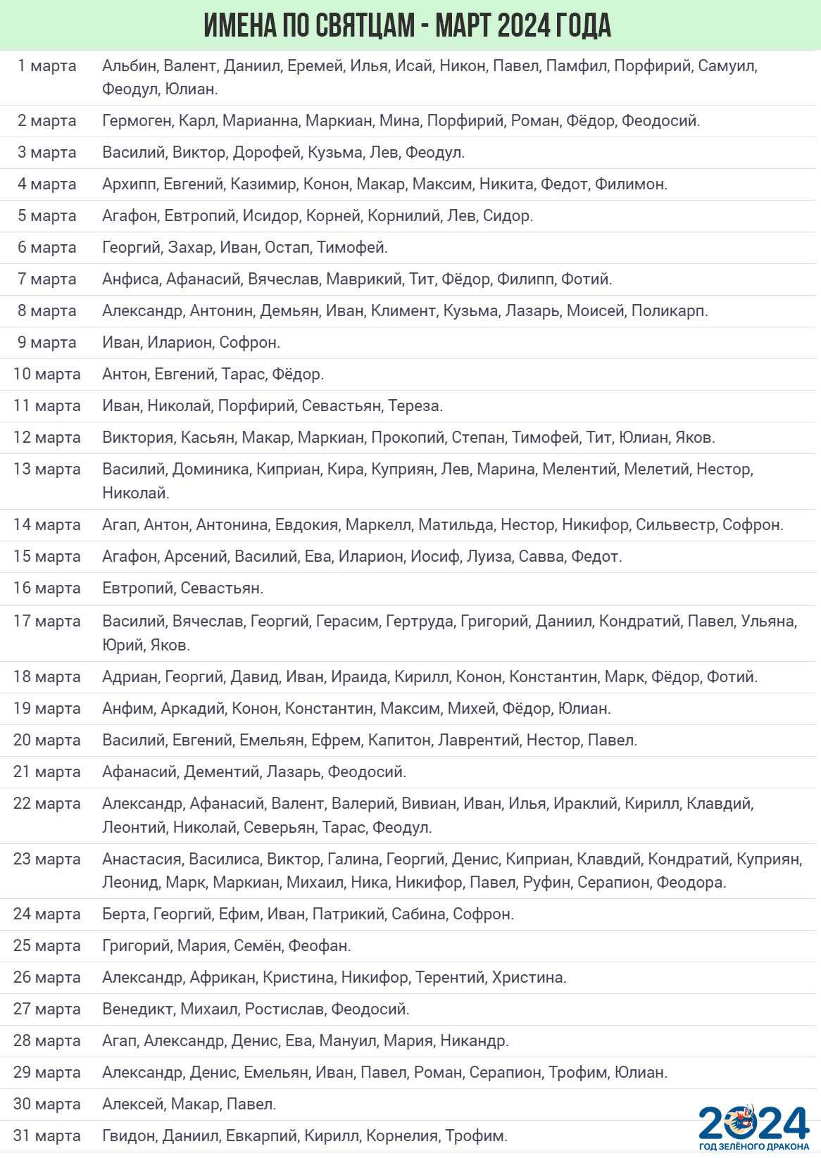 Если ваш День Рождения или дата Крещения приходится на первый месяц весны, то предлагаем найти имя своего святого покровителя в данном списке: