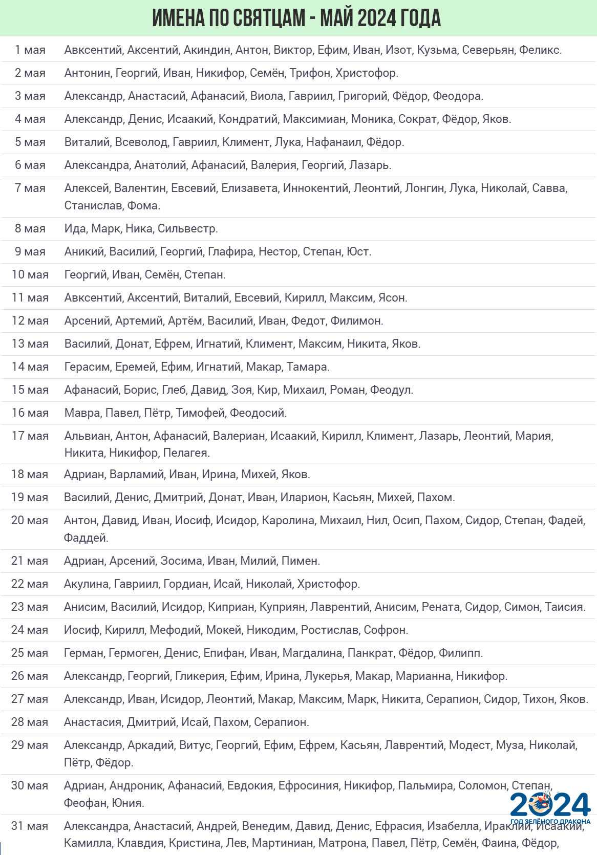 В конце весны православный календарь имен по дате рождения предписывает нарекать мальчиков и девочек так: