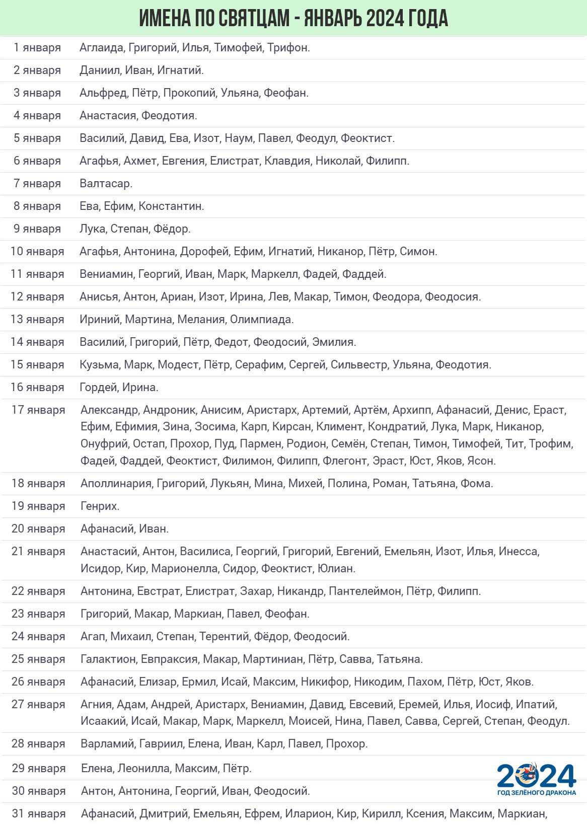 В январе 2024 года Именины будут праздновать обладатели таких имен: