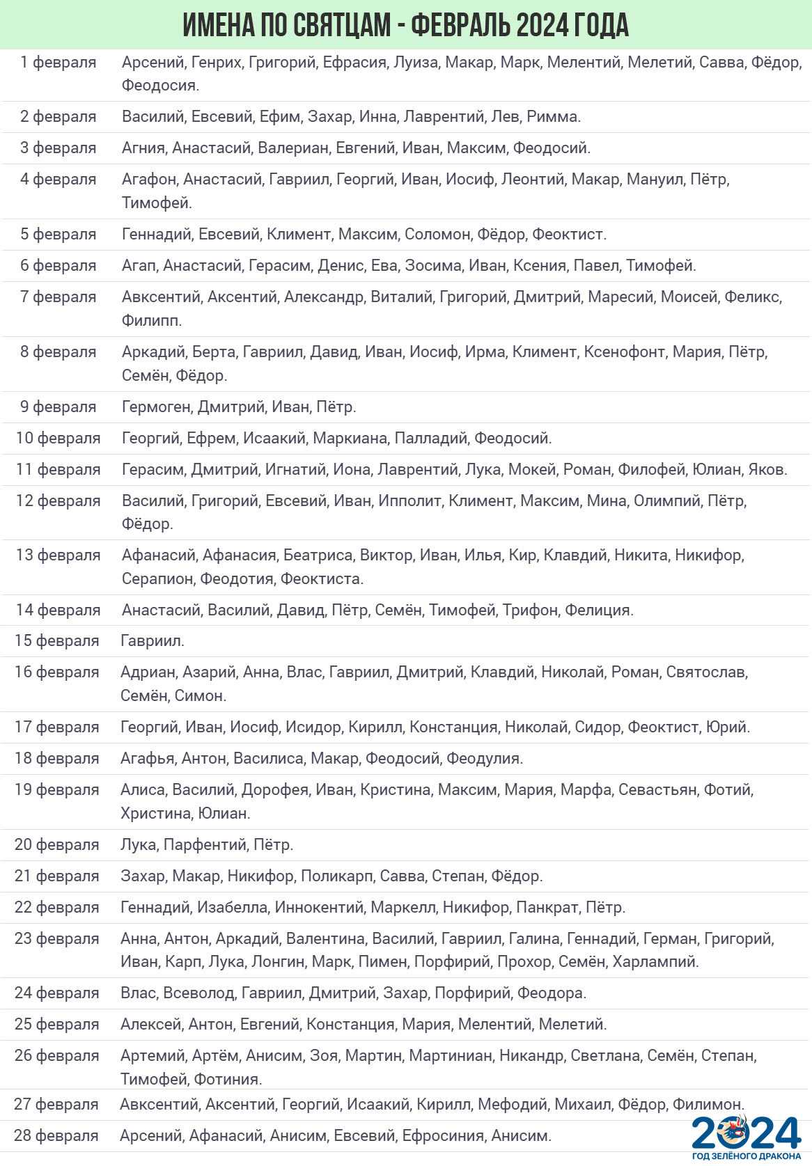 В феврале 2024 года Святцы предписывают праздновать Именины тем, кто носит следующие христианские имена: